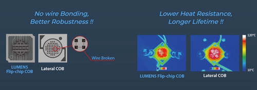 Flip Chip သည် ပိုမိုမြင့်မားသော လျှပ်စီးကြောင်းကို ခံနိုင်ရည်ရှိပြီး နီလာမှတစ်ဆင့် အပူပျံ့ခြင်း မရှိသောကြောင့် တောက်ပမှုကိုလည်း ပေးစွမ်းနိုင်ပါသည်။